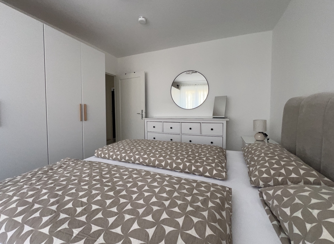 Beim Betreten der Wohnung gelangen Sie in einen hellen Flur. Rechts befindet sich das Badezimmer, das mit einem Fenster, einer Badewanne und einer Duschabtrennung ausgestattet ist. Das angrenzende Schlafzimmer bietet ausreichend Platz und wird durch ein großes Fenster lichtdurchflutet.