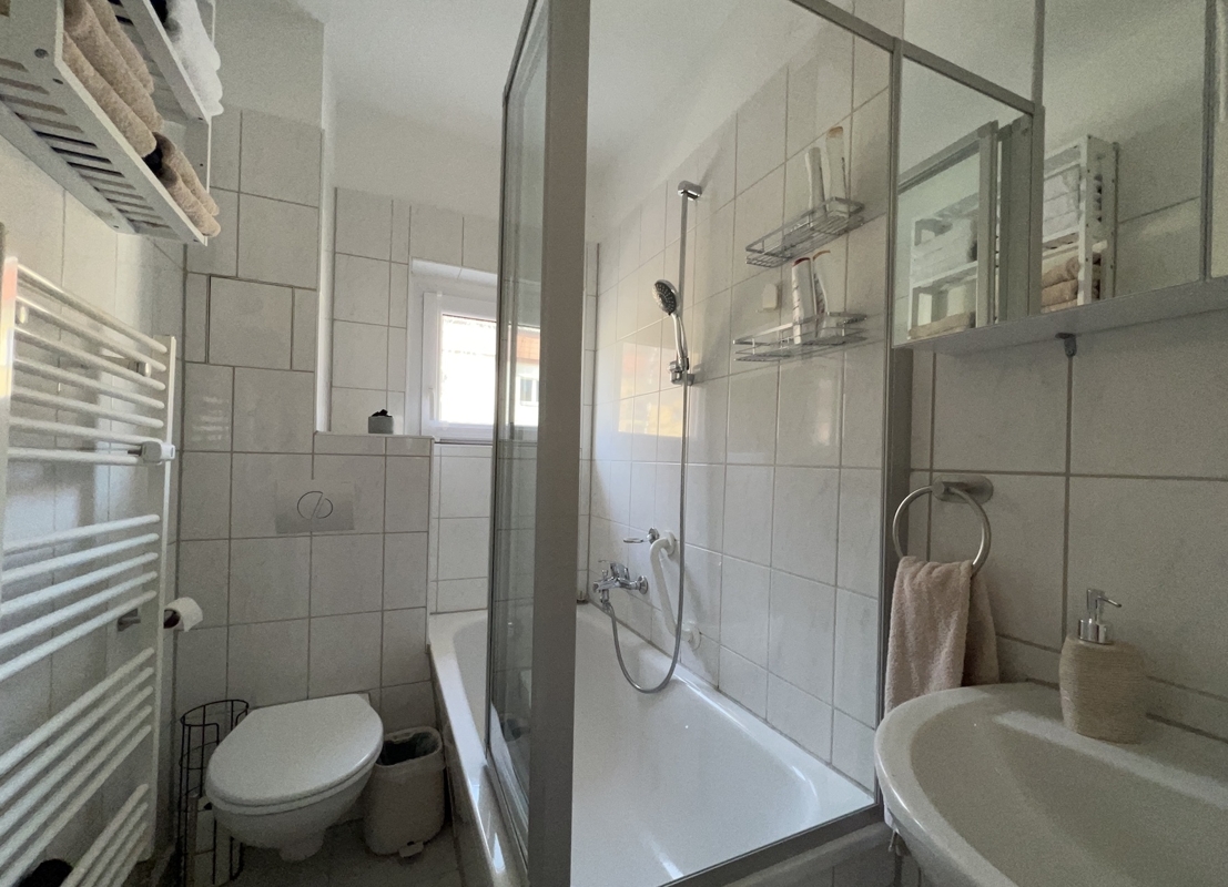 - Badezimmer mit Wanne, Duschabtrennung und beheizbarem