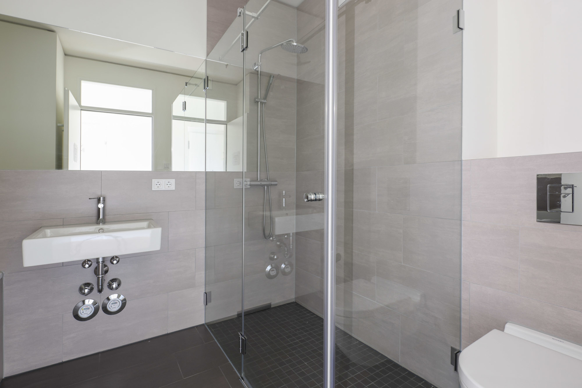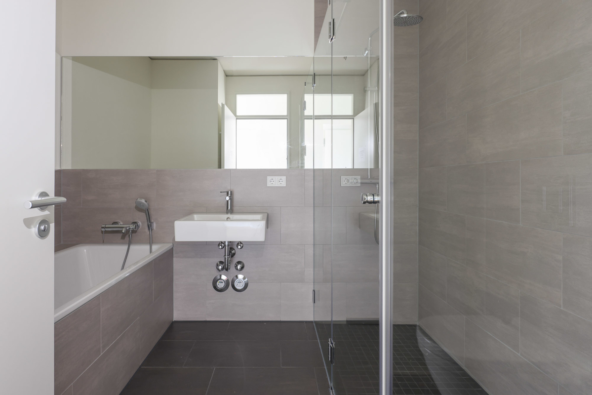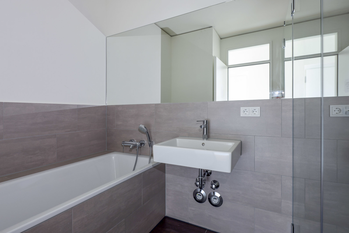 In der Wohnung befindet sich ein innenliegendes Badezimmer mit bodengleicher Dusche und Badewanne, welches in hellen Steinfarben gefliest ist sowie ein innenliegender Abstellraum. Es gibt im Flurbereich ausreichend Platz für eine Gaderobe im Eingangsbereich.